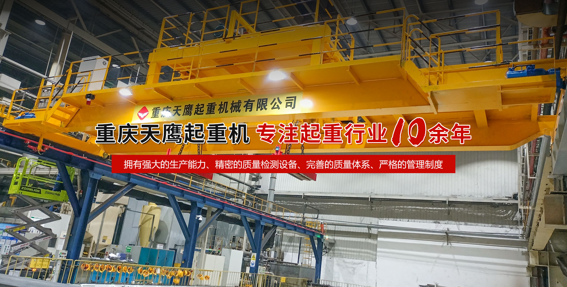 重慶天鷹起重機(jī)械有限公司成立于2014年,主營(yíng)起重機(jī)的銷售、安裝和維護(hù)等相關(guān)服務(wù)。中國(guó)重型機(jī)械工業(yè)協(xié)會(huì)員單位、為中國(guó)工程機(jī)械工業(yè)協(xié)會(huì)工程機(jī)械維修分會(huì)會(huì)員單位及西南地區(qū)起重機(jī)械定點(diǎn)安裝維修單位。具有國(guó)家質(zhì)量監(jiān)督檢疫總局頒發(fā)的特種設(shè)備安裝維修改造質(zhì)格證書。并率先通過了IS09001-2000質(zhì)量體系認(rèn)證?! 」咀?cè)資金3000萬元;廠房面積2萬平方米;各種生產(chǎn)檢測(cè)設(shè)備50臺(tái)套,公司技術(shù)力量雄厚,聘請(qǐng)了國(guó)內(nèi)知名起重機(jī)專家、工程技術(shù)人員擔(dān)當(dāng)項(xiàng)目經(jīng)理、技術(shù)總工程師及顧問?,F(xiàn)擁有員工100多人,其中工程技術(shù)人員12人。 主導(dǎo)產(chǎn)品為各類橋、門式起重機(jī)及輕小型起重設(shè)備,具備生產(chǎn)起重量200t及以下通用橋、門式起重機(jī)的能力,尤其在200t以下起重機(jī)產(chǎn)品上具備較強(qiáng)的市場(chǎng)競(jìng)爭(zhēng)力,為許多行業(yè)設(shè)計(jì)制造了技術(shù)含量高、技術(shù)性強(qiáng)的起重設(shè)備,許多產(chǎn)品在原設(shè)計(jì)標(biāo)準(zhǔn)上進(jìn)行了較大的改進(jìn)、優(yōu)化和創(chuàng)新;其中NH型系列電動(dòng)葫蘆、HD型電動(dòng)單梁處于國(guó)內(nèi)高水平..... 好的產(chǎn)品品質(zhì)需要由較高的裝備水平來保證,公司購(gòu)買了“大型數(shù)控落地鏜”、“數(shù)控切割機(jī)床”、“自調(diào)式焊接滾輪機(jī)”、“數(shù)顯液壓板料折彎?rùn)C(jī)”、“超大型數(shù)控臥式車床”、“數(shù)控液壓水平下調(diào)式三輥卷板機(jī)”、“單柱移動(dòng)式立式車床”“擁有用于單梁生產(chǎn)的全國(guó)一條拋丸噴漆烘干線、葫蘆噴漆烘干線和全國(guó)較大的100T葫蘆試驗(yàn)臺(tái)和檢測(cè)中心”等各種先進(jìn)的加工設(shè)備,新建廠房面積近2萬平方米?! ≠|(zhì)量是企業(yè)的生命,天鷹公司依據(jù)“ISO 9001國(guó)際質(zhì)量管理體系”標(biāo)準(zhǔn),制定并完善了公司的質(zhì)量管理體制。堅(jiān)持質(zhì)量體系的內(nèi)審和外審,將質(zhì)量管理工作落實(shí)到企業(yè)生產(chǎn)經(jīng)營(yíng)的全過程?! ∧奈⑿Γ翘禚椨篮愕淖非螅惶禚椀姆?wù),是您首要的選擇!因?yàn)槲覀儓?jiān)信:“誠(chéng)信是本、質(zhì)量鑄就品牌”。為您服務(wù)是我們的榮耀,勤奮而進(jìn)取的天鷹人,時(shí)刻期盼著您的到來。